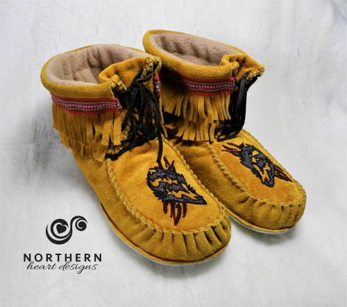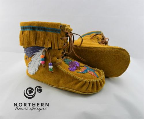 The Scout is a high moccasin / short mukluk style boot that is fashion forward but also makes for a perfect traditional dancing moccasin. It features lacing up the front and a layer of fringe around the top, accented in various ways, much like our Fringed Summer Mocs.
