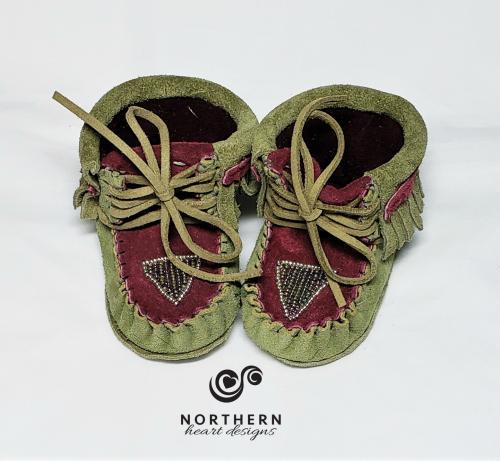 This pair of beaded toddler Trampers are done in green with burgundy suede. The tramper is a mini version of the adult scout-style moccasins and feature laces at the ankle. They're fleece-lined with a secondary exterior suede sole. Perfect for natural foot movement walking. Indoor/outdoor use.