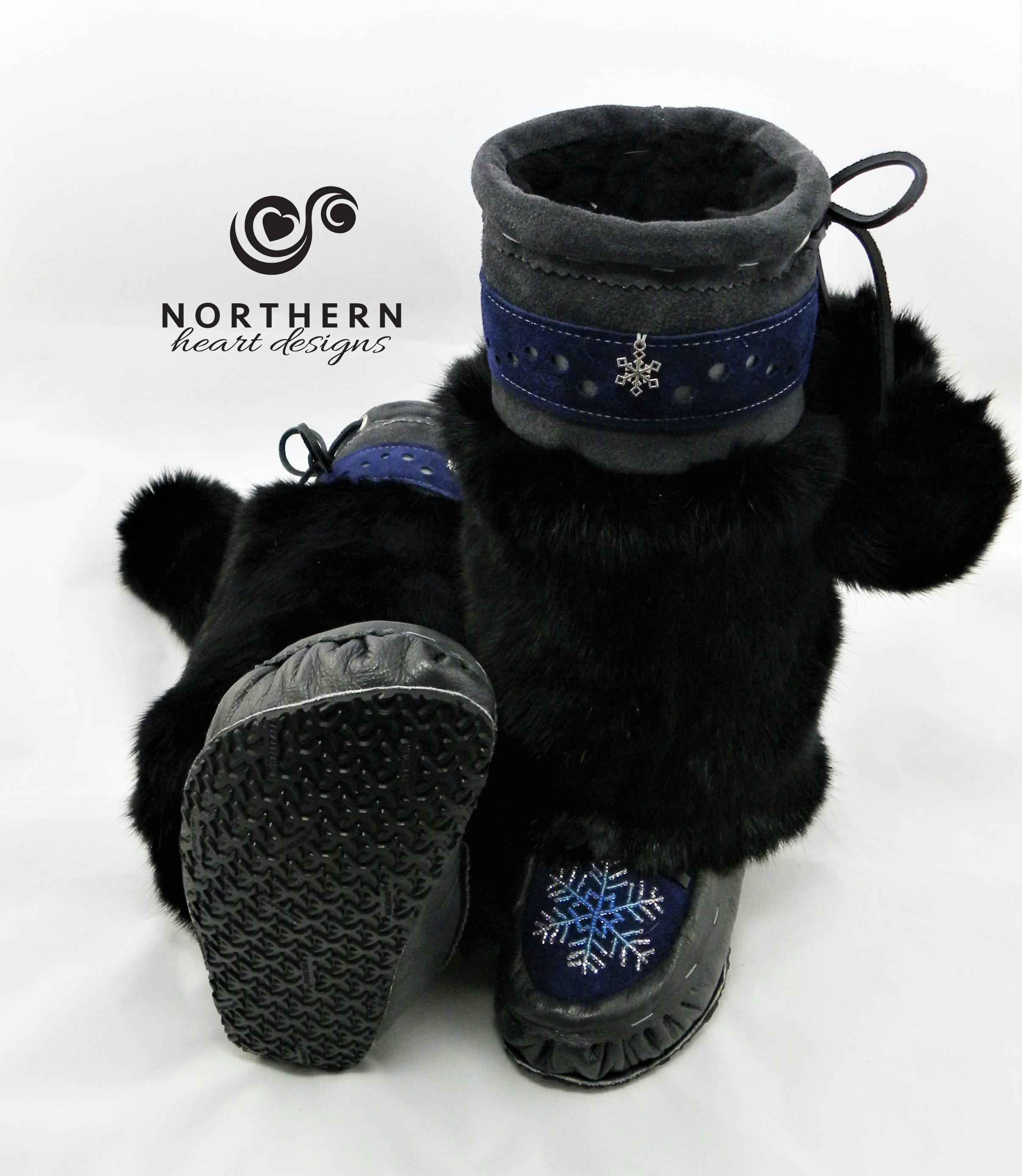 Our traditionally styled youth mukluks are available in your choice of colors for both the hide and fur as well as well as beading color and image selection for the foot vamps (slightly smaller or more simplified versions of what would appear on adult-priced mukluks). Like our adult Three-Quarter style mukluks, they have a coordinating accent strip in the top leather section. Having them done with a bit more leather above the fur and additional beading to make them Top-Bead Style is also an option. Standard, they are done in the normal suede finish hides and rabbit fur, they come with pompoms and they come standard with secondary exterior leather soles that are finished with our mukluk rubber layer for cold traction and longevity. Smooth finished leather option is available.